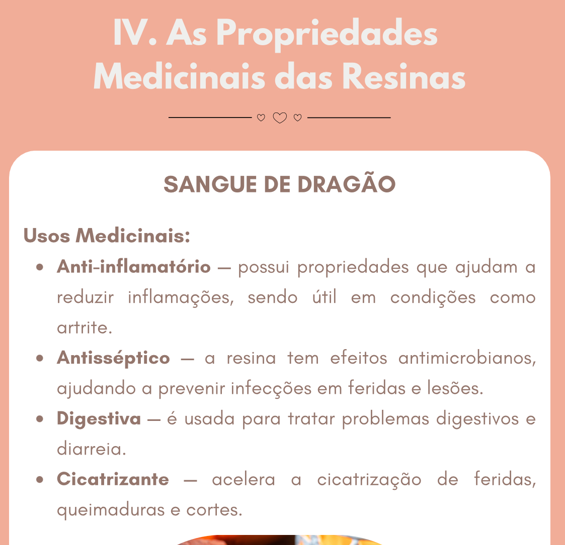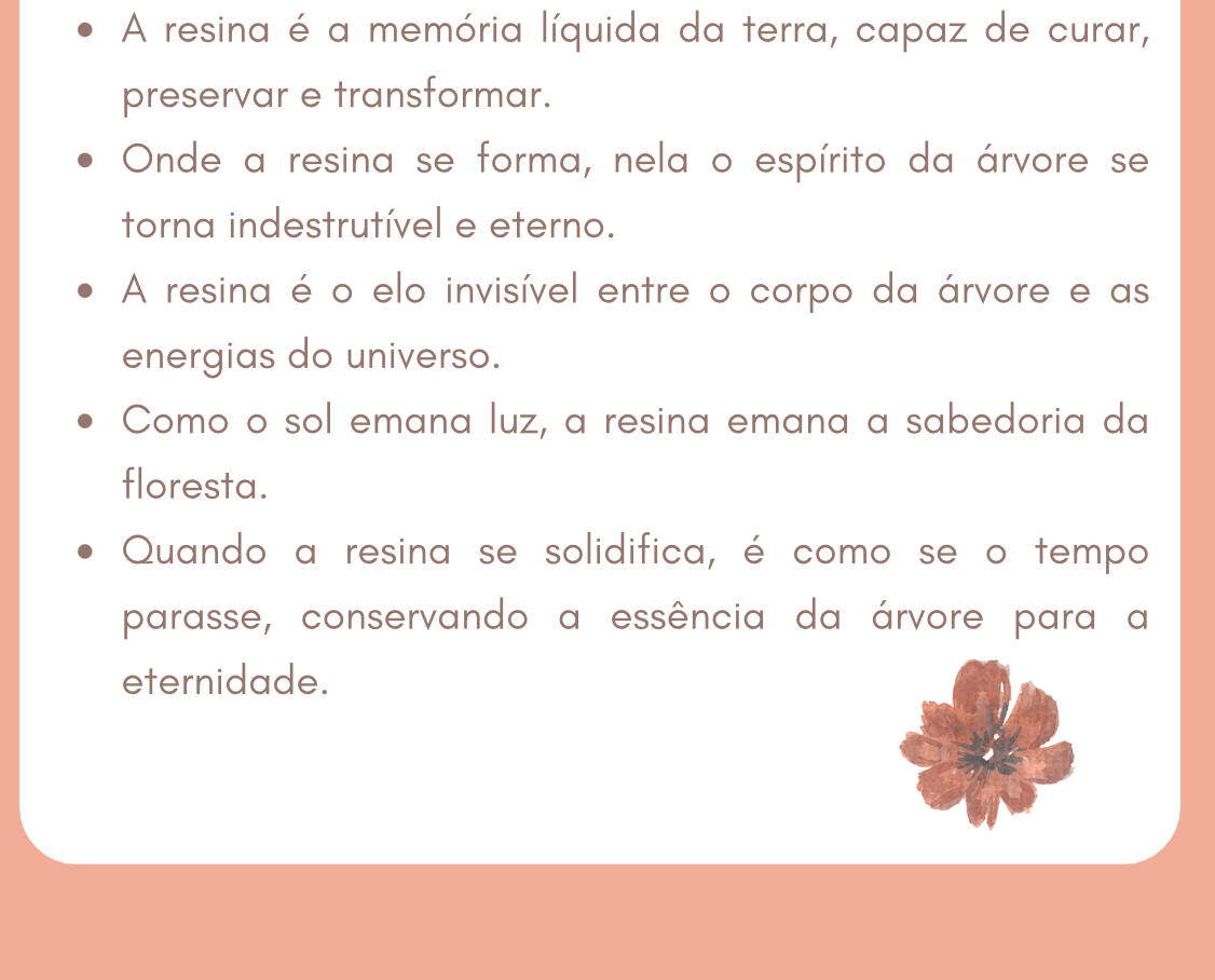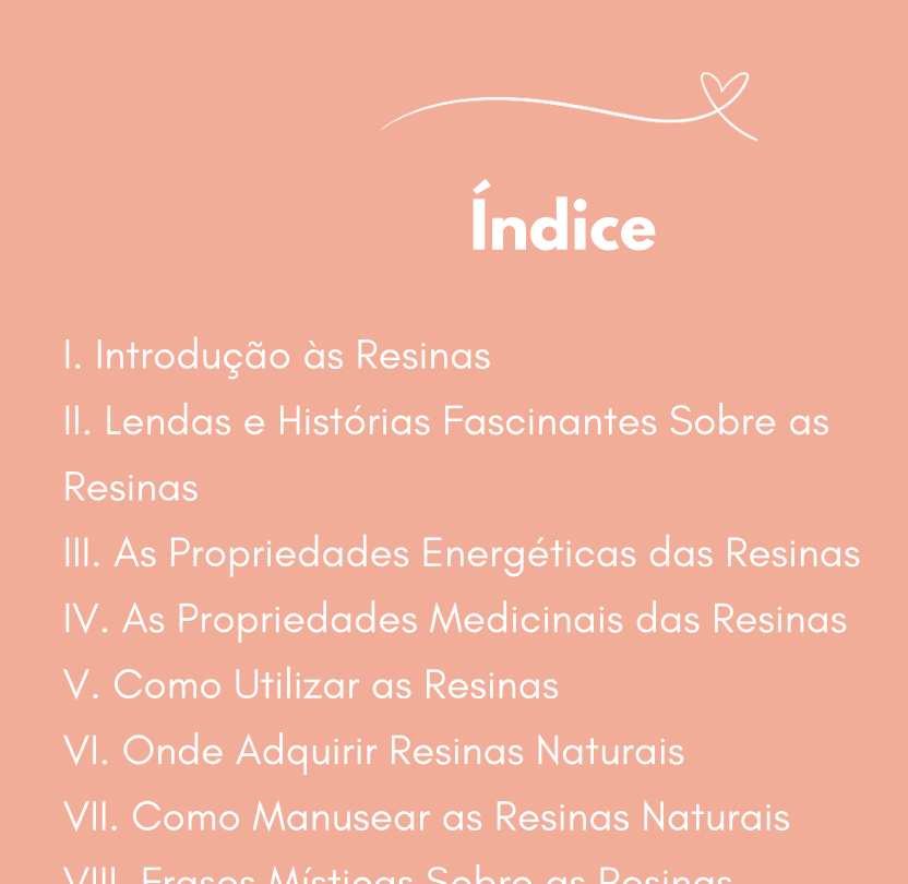 Depois de vários anos a explorar a magia única das resinas naturais, decidi juntar muitas das minhas descobertas nestas mais de 60 páginas. Ao longo deste ebook partilho contigo informações únicas sobre dez das mais incríveis resinas que alguma vez conheci e aprofundo imensos benefícios energéticos e espirituais de cada uma delas.